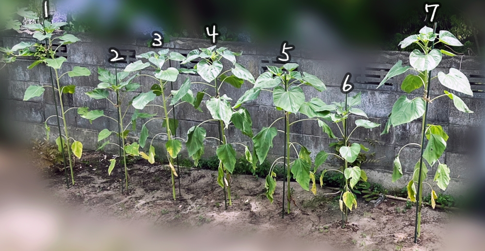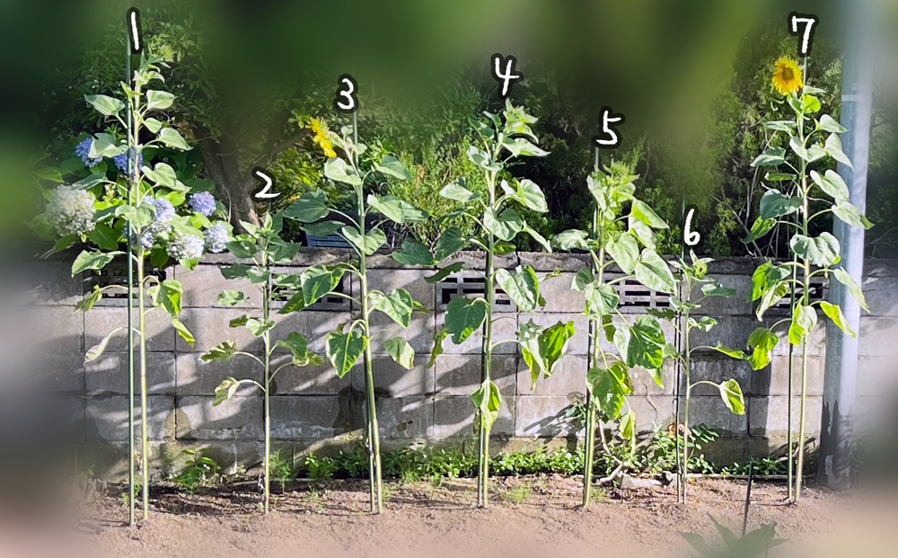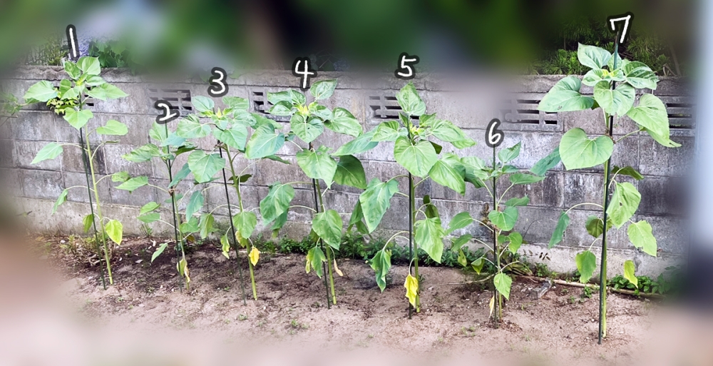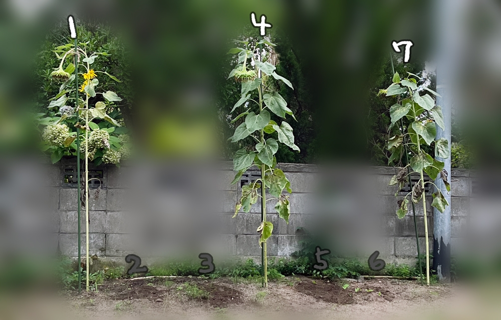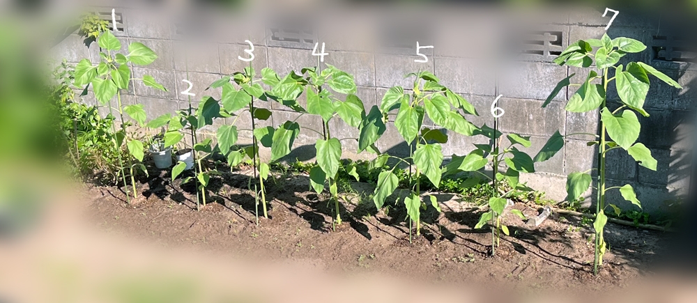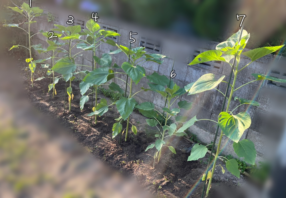 使用したタネはホームセンター等に売っている大輪ひまわりとダイソーのひまわり。写真の記録でわかるように、意外とダイソーのタネが元気でした。異常な成長速度で伸び具合も葉っぱの大きさも素晴らしく常にピンピンしていました。※成長の違いは植えた場所と間隔にもよるのかもしれません。両端と真ん中が突出しているので、もう少し間隔をあけて植えたらよかったのかも。