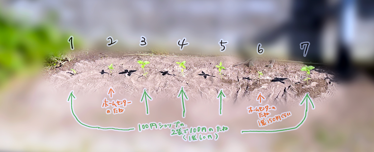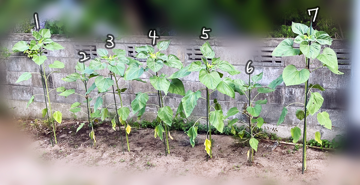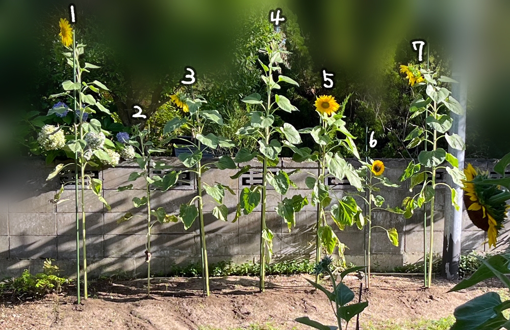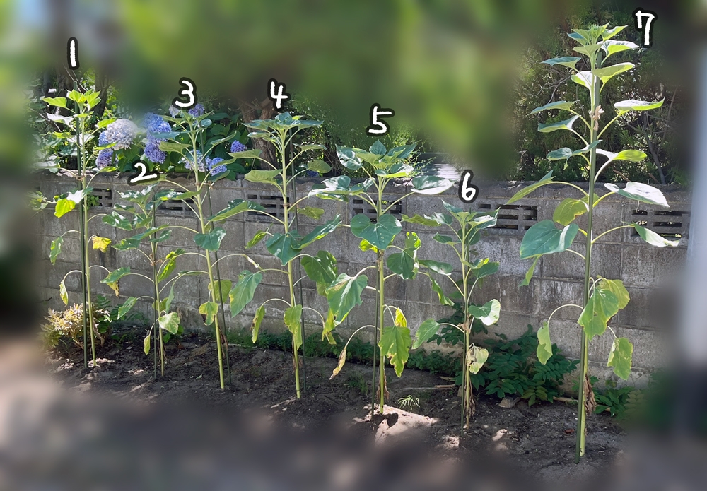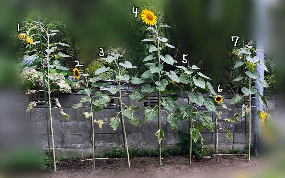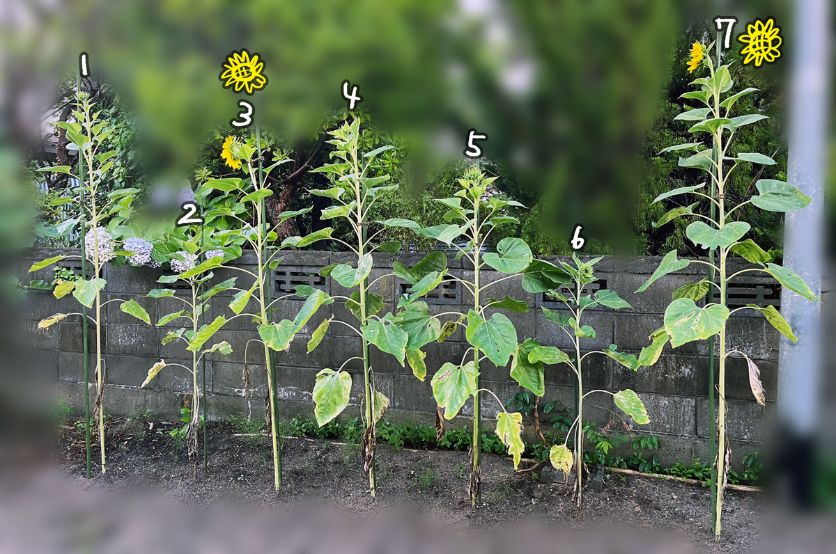 使用したタネはホームセンター等に売っている大輪ひまわりとダイソーのひまわり。写真の記録でわかるように、意外とダイソーのタネが元気でした。異常な成長速度で伸び具合も葉っぱの大きさも素晴らしく常にピンピンしていました。※成長の違いは植えた場所と間隔にもよるのかもしれません。両端と真ん中が突出しているので、もう少し間隔をあけて植えたらよかったのかも。