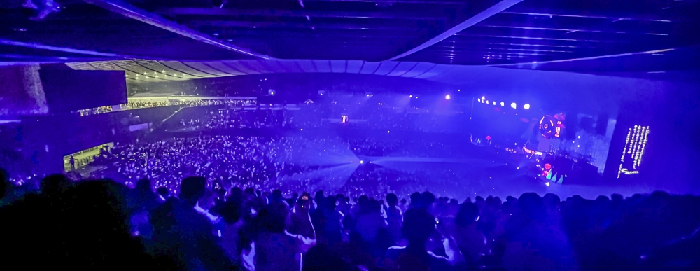 人生初めてのアリーナ。反対側の人が点のように見える。人の多さと会場の規模に驚く。このスタンド席の良さというのは、会場全体を見渡せることだと分かった。ライブ中、会場が暗いとしゃもじライトが星のようになって動いてるのが本当に綺麗。スタンド席のほぼ頂上で急斜面なので、ジャンプしたり動くタイプの曲の時は危ない。